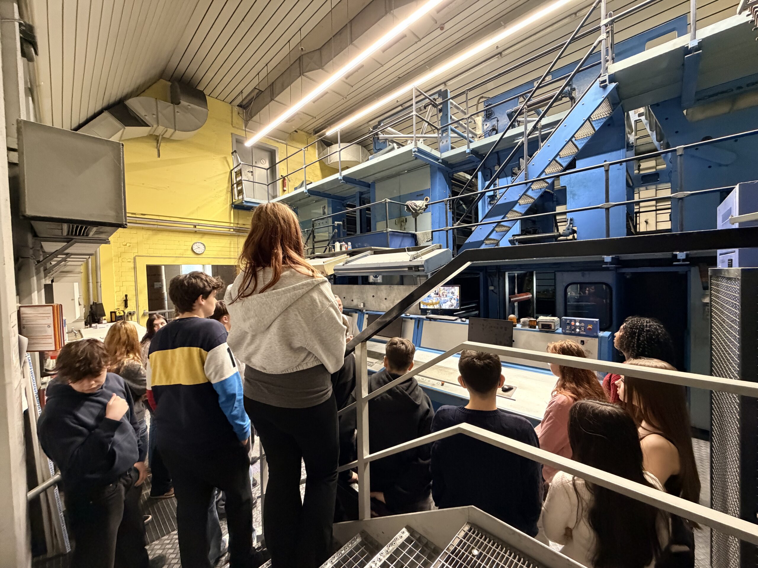 Der Besuch der Druckerei war schließlich ein echtes Highlight: Dort bestaunten die Achtklässler riesige Papierrollen, hauchdünne Aluminium-Druckplatten und die gigantischen Farbtanks in Cyan, Magenta, Gelb und Schwarz. Eindrucksvoll war zu sehen, wie aus verschiedenen Farbschichten ein fertiger Zeitungsdruck entsteht, bevor die Seiten geschnitten, sortiert und gefalzt werden.