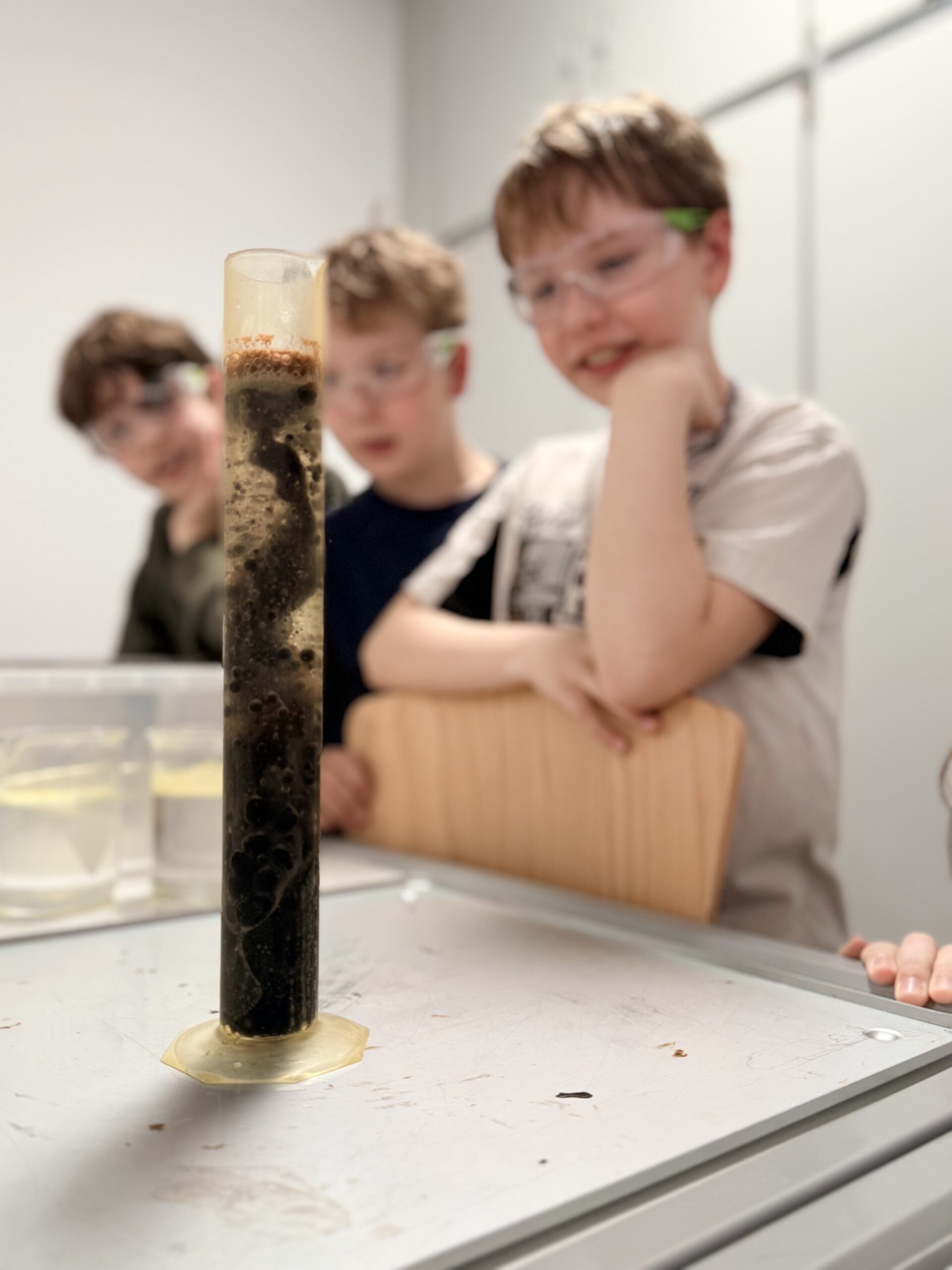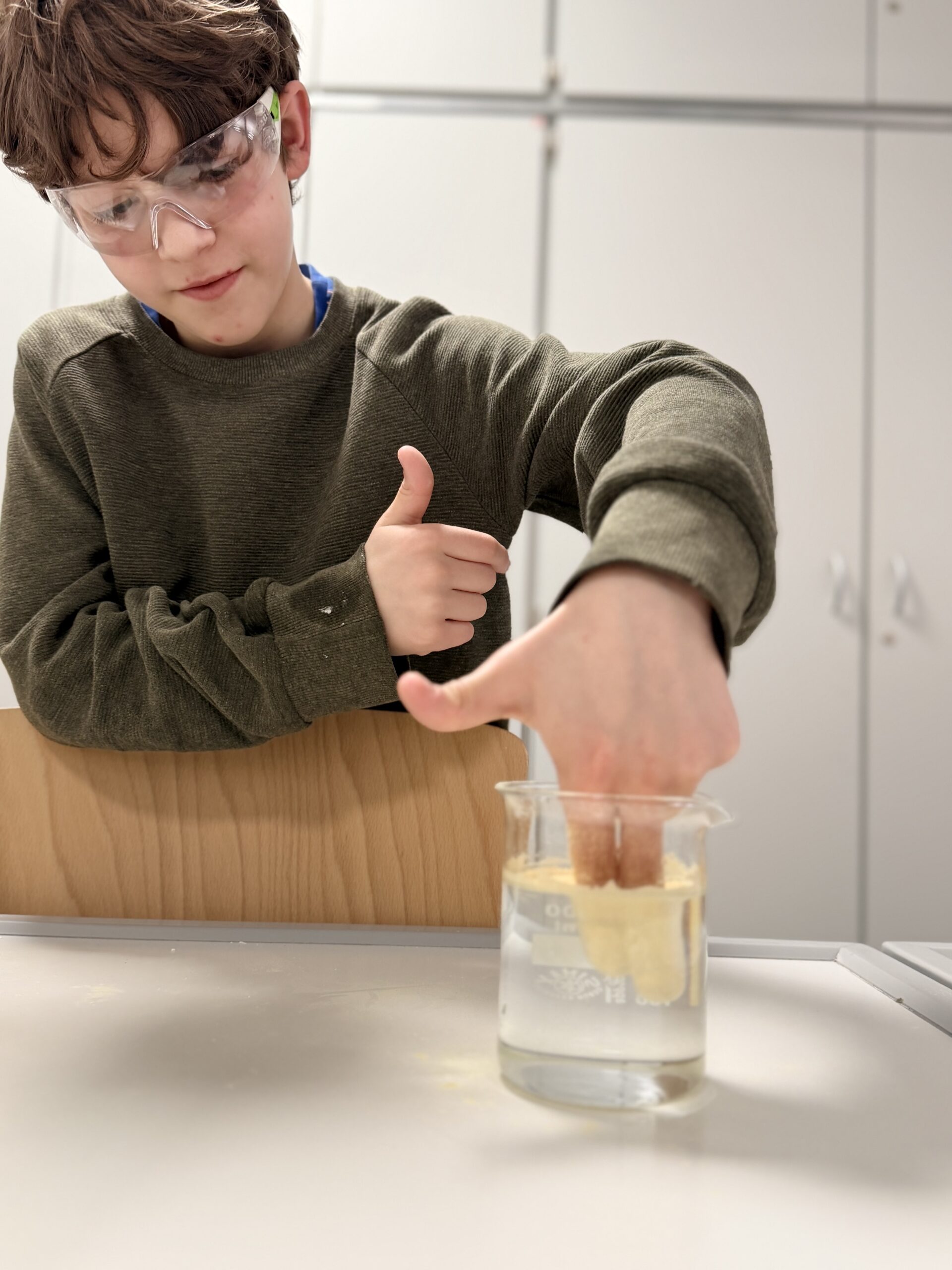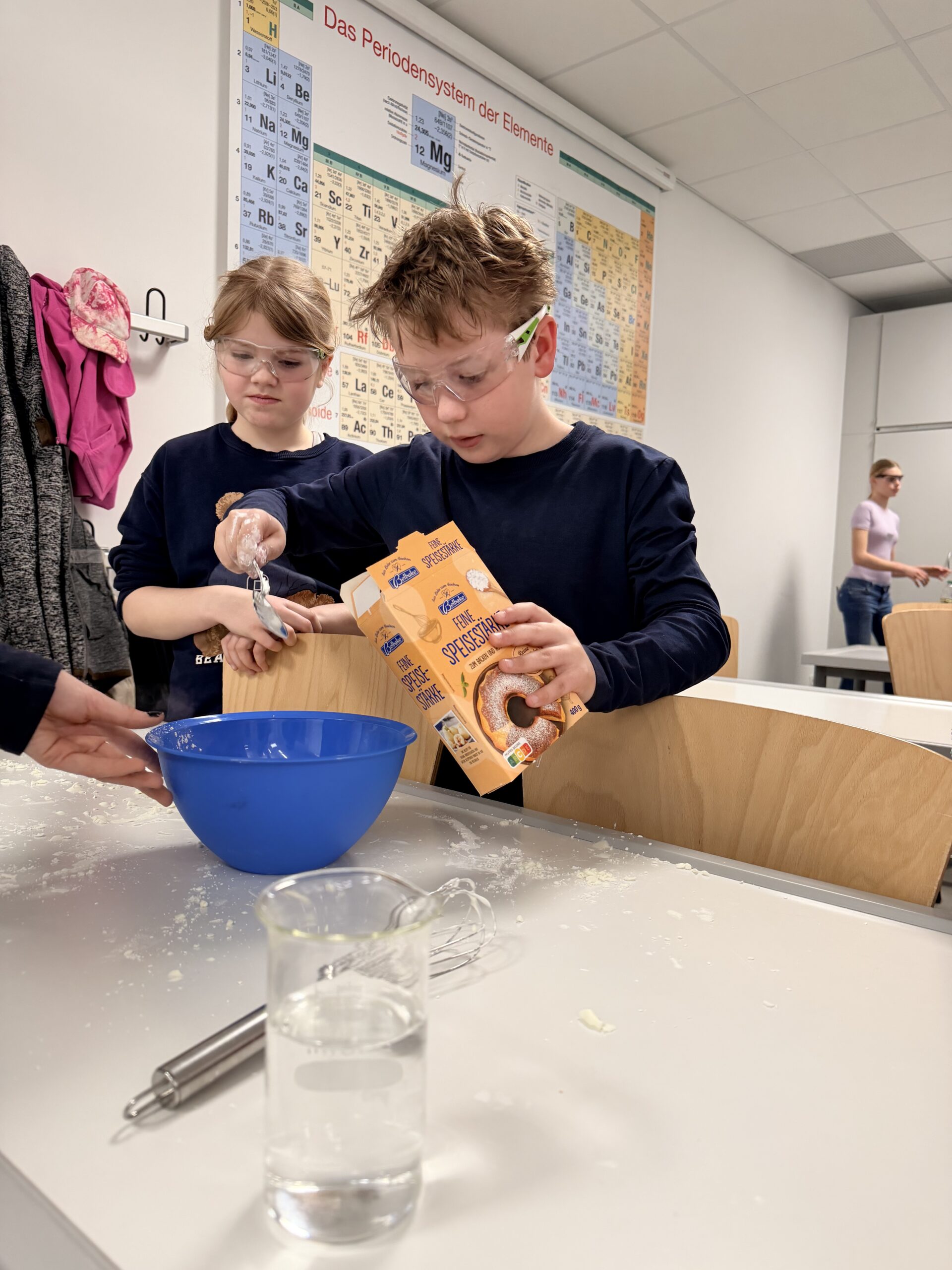 In kleinen Gruppen durften die Grundschüler mehrere spannende Experimente ausprobieren: Mit Hilfe eines Brenners verwandelten sie eine unscheinbar orangefarbene Indikatorlösung in ein leuchtend grünes Gemisch und beobachteten dabei eindrucksvoll, wie Hitze eine chemische Reaktion auslösen kann. Ein scheinbar gewöhnlicher „magischer Brei“ wurde plötzlich fest, ließ sich kneten – ein faszinierendes Beispiel für ungewöhnliche Stoffeigenschaften mit handelsüblichen Mitteln erzeugt.